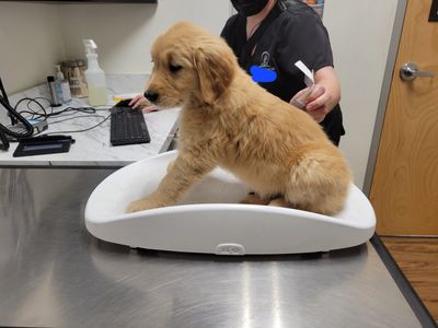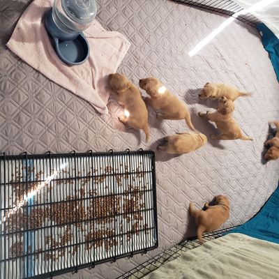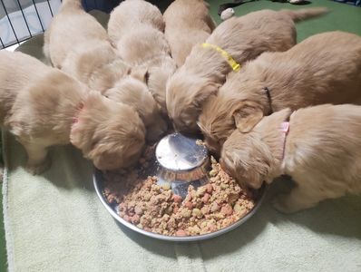 At 4 weeks, we move to puppy mush - which is a mix of puppy food and milk or water. This mix helps to soften the food and make it easier to consume, especially with their new teeth. In the last week, we slowly reduce the amount of water added so they can be on regular puppy kibble before pickup day.
